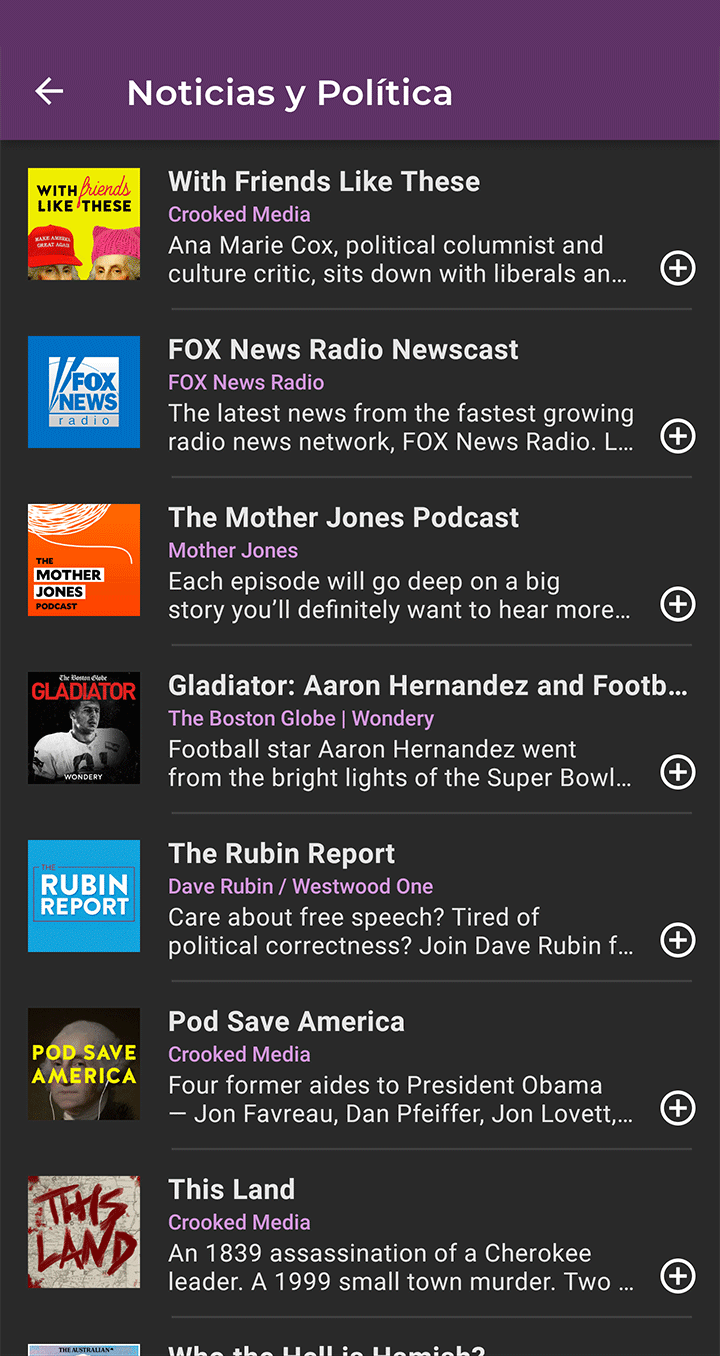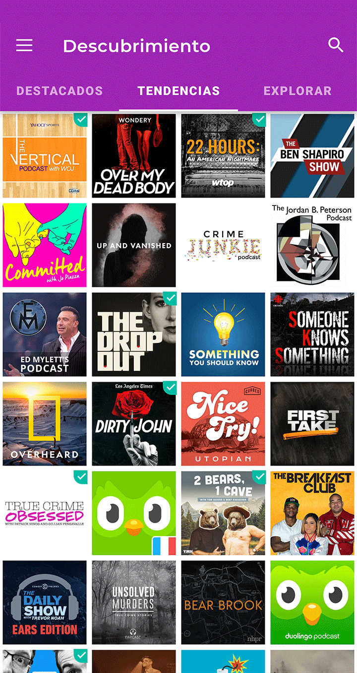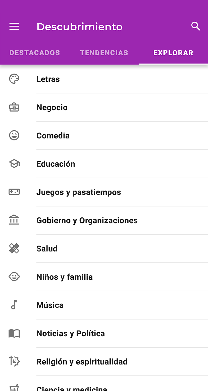 Descubre podcasts en nuestra sección de destacados o de los podcasts más populares en tendencias y busca en los géneros más populares como Comedia, Negocios, Noticias, Política y muchos más.